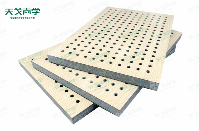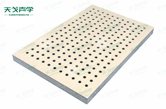 天戈玻镁板孔木吸音板饰面颜色及材料选择性广,孔径、孔距可根据客户要求调整,能很好地满足客户多样化的声学及装饰需求。孔木吸音板对吸声频谱选择性较强,对中低频有很好的吸声性能。如在吸声结构后空腔上填入适量的吸声棉可提高中、高频吸声效果。