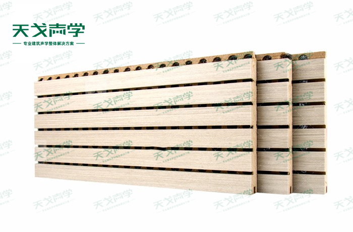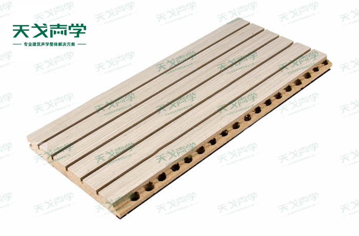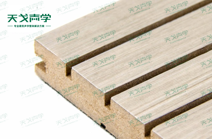 天戈槽孔吸音板是一种在密度板的正面开槽、背面穿孔的狭缝共振吸音材料。槽木吸音板对吸声频谱选择性很强,对中低频有很好的吸声性能。若在吸声结构后空腔填入适量的吸声棉可提高中、高频吸声效果,标准化模块设计,采用插槽、龙骨结构,安装简易,常用于墙面或天花装饰。
