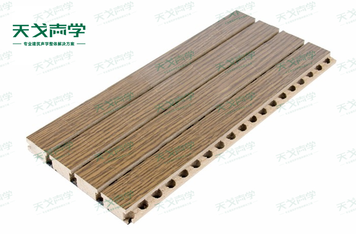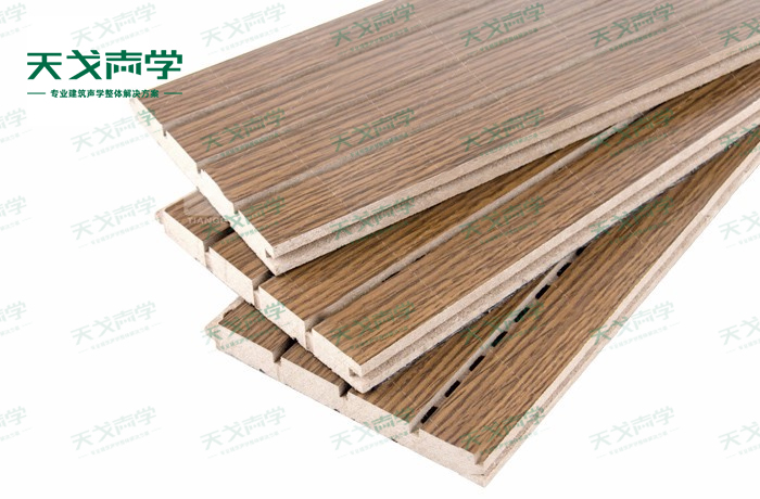 天戈木质槽条吸音板是一种在密度板的正面开槽、背面穿孔的狭缝共振吸音材料。槽木吸音板对吸声频谱选择性很强,对中低频有很好的吸声性能。若在吸声结构后空腔填入适量的吸声棉可提高中、高频吸声效果,标准化模块设计,采用插槽、龙骨结构,安装简易,常用于墙面或天花装饰。
