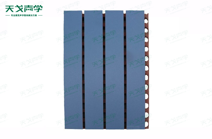 天戈演播厅槽条吸音板是一种在密度板的正面开槽、背面穿孔的狭缝共振吸音材料,多孔式吸音设计,有效使声波的能量消耗变换成热能达到吸音效果。槽木吸音板对演播厅吸声频谱选择性很强,对中低频有很好的吸声性能,吸声频谱宽、低频吸声系数高。若在吸声结构后空腔填入适量的吸声棉可提高中、高频吸声效果,标准化模块设计,采用插槽、龙骨结构,安装简易,常用于墙面或天花装饰。