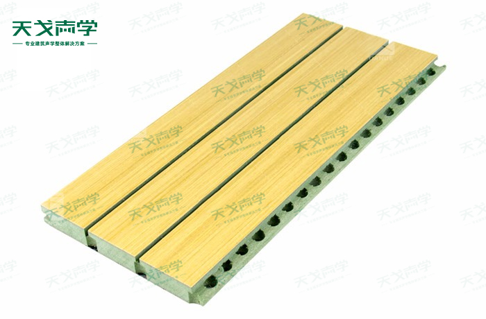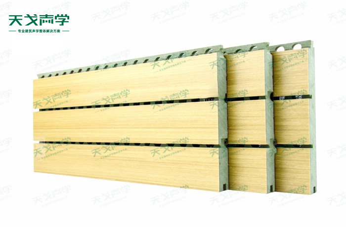 天戈体育馆槽木吸音板是一种在密度板的正面开槽、背面穿孔的狭缝共振吸音材料。体育馆槽木吸音板对吸声频谱选择性很强,对中低频有很好的吸声性能。若在吸声结构后空腔填入适量的吸声棉可提高中、高频吸声效果,标准化模块设计,采用插槽、龙骨结构,安装简易,常用于墙面或天花装饰。