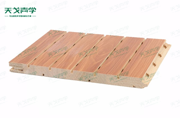 天戈音乐厅槽木吸音板是一种在密度板的正面开槽、背面穿孔的狭缝共振吸音材料。槽木吸音板对吸声频谱选择性很强,对中低频有很好的吸声性能。若在吸声结构后空腔填入适量的吸声棉可提高中、高频吸声效果,标准化模块设计,采用插槽、龙骨结构,安装简易,常用于墙面或天花装饰。