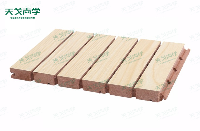 天戈录音室槽木吸音板是一种在密度板的正面开槽、背面穿孔的狭缝共振吸音材料。槽木吸音板对吸声频谱选择性很强,对中低频有很好的吸声性能。若在吸声结构后空腔填入适量的吸声棉可提高中、高频吸声效果,标准化模块设计,采用插槽、龙骨结构,安装简易,常用于墙面或天花装饰。