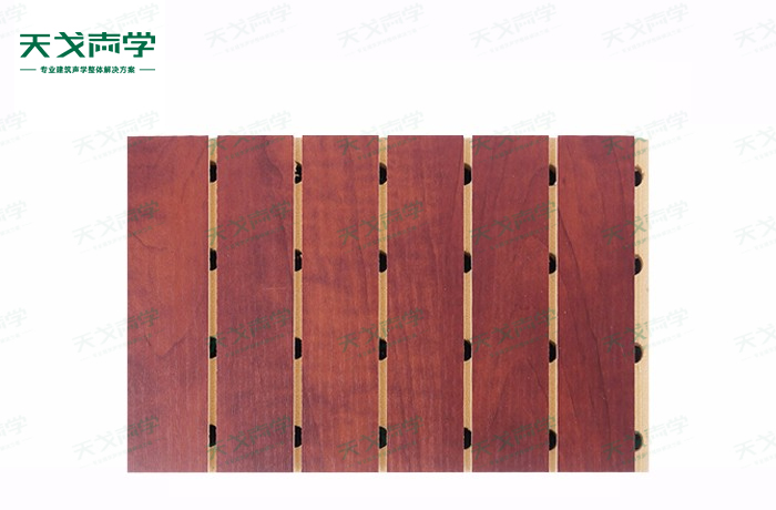 天戈电影院槽木吸音板是一种在密度板的正面开槽、背面穿孔的狭缝共振吸音材料。槽木吸音板对吸声频谱选择性很强,对中低频有很好的吸声性能。若在吸声结构后空腔填入适量的吸声棉可提高中、高频吸声效果,标准化模块设计,采用插槽、龙骨结构,安装简易,常用于墙面或天花装饰。