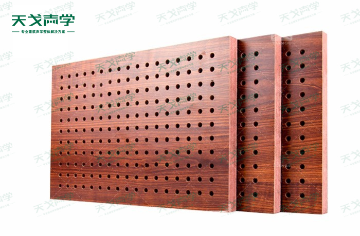 天戈墙面穿孔吸音板饰面颜色及材料选择性广,孔径、孔距可根据客户要求调整,能很好地满足客户多样化的声学及装饰需求。孔木吸音板对吸声频谱选择性较强,对中低频有很好的吸声性能。如在墙面穿孔吸音板吸声结构后空腔上填入适量的吸声棉可提高中、高频吸声效果。