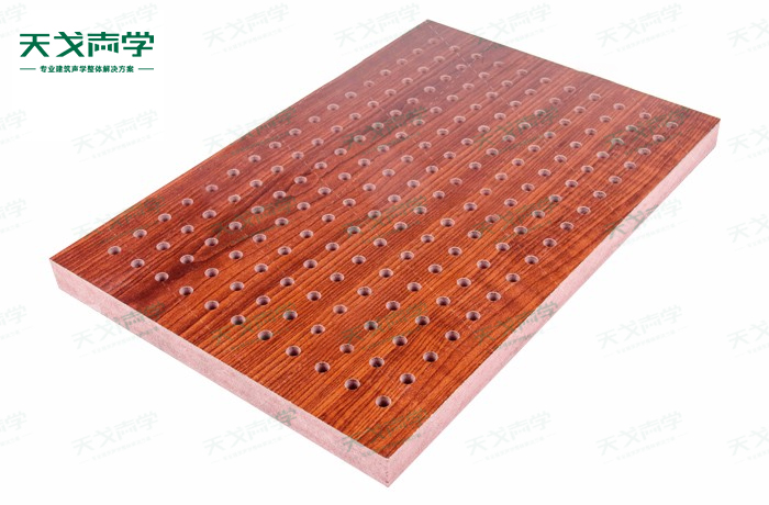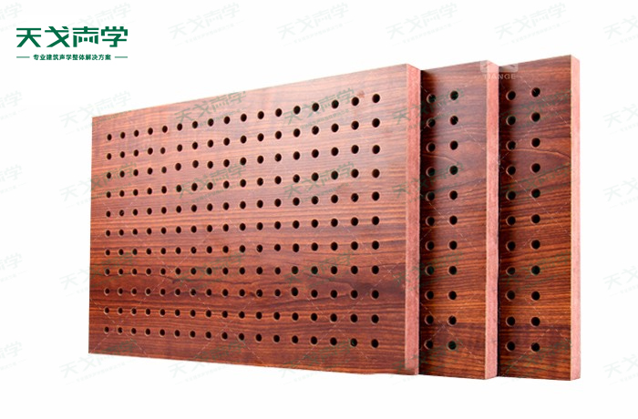 天戈会议室孔木吸音板饰面颜色及材料选择性广,孔径、孔距可根据客户要求调整,能很好地满足客户多样化的声学及装饰需求。孔木吸音板对吸声频谱选择性较强,对中低频有很好的吸声性能。如在吸声结构后空腔上填入适量的吸声棉可提高中、高频吸声效果。
