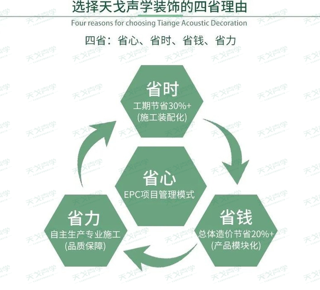 在天戈声学EPC项目管理模式下,自身强大的产品自主生产能力、装配式施工模式、产品模块化的情况下能够为客户提供优质的四省服务——既省心、省力、省时、省钱。