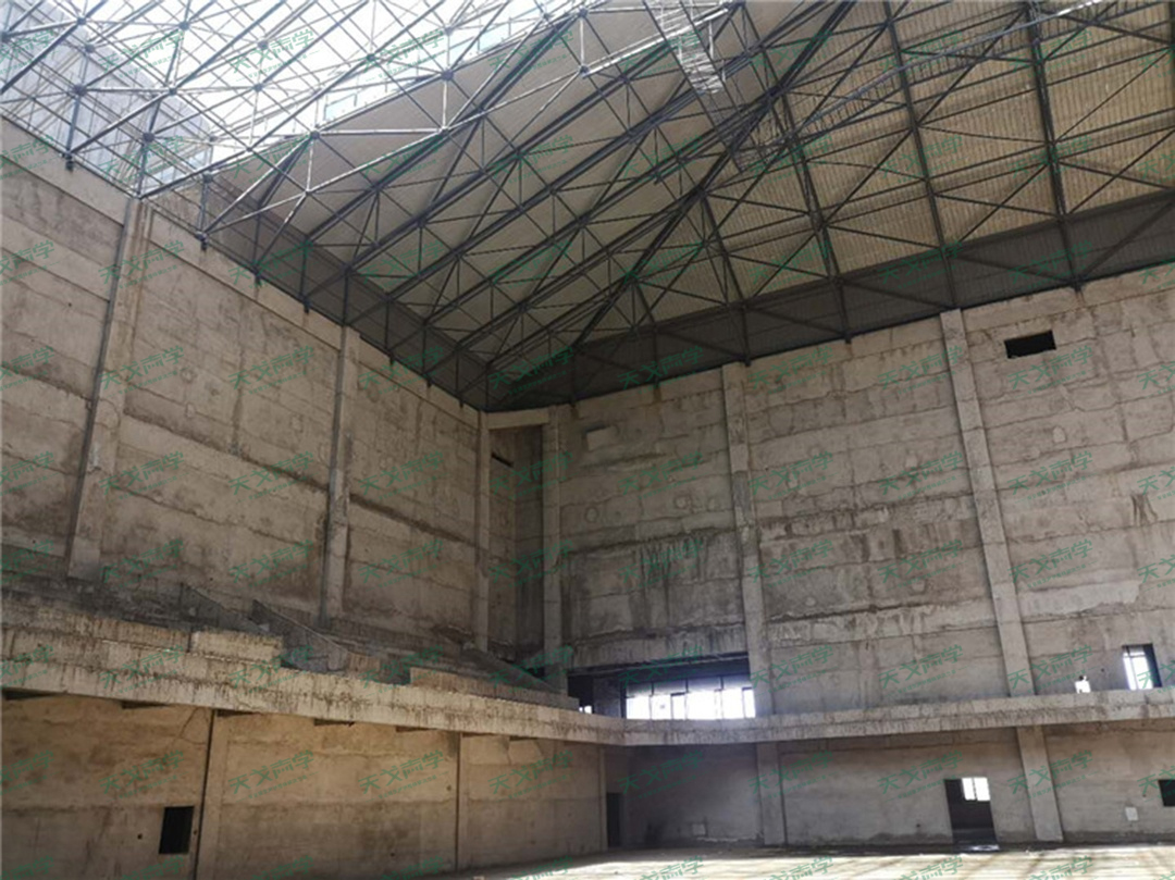 体育馆平面呈一矩形,剖面为不规则几何形,馆内顶面钢架距离建筑地面最高高度为35m,纵长56.7m。馆内有效容积为79185m3,总表面积为11340㎡,预计容纳人数3000人。