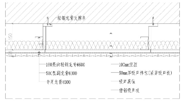结构:50mm厚吸声棉包+吸声黑毡+槽铝吸音板