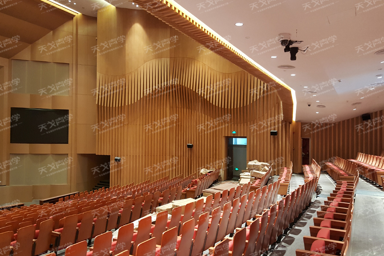 观众厅两侧墙面为典型的平行墙面,在没有经过任何声学处理的情况下,将会产生多重回声,导致中后排作为听众听音浑浊。如果只进行简单地吸声处理,由于该场所还兼顾有演艺功能,在作为演艺厅使用时由于两侧墙面反射声能吸声过量导致整个场所听音干涩,无层次感。因此该墙面必须考虑吸声控制混响,还考虑扩散使整个声场分布均匀。因此表面采用实木格栅做扩散体造型。后墙和挑台处墙面距离声源较远、中高频声能衰减较明显,因此此处采用具有低频吸声较好的材料,木质穿孔吸声结构:木质穿孔吸声结构穿孔率为11%,内填50m48K离心玻璃棉后贴吸声黑毡。
