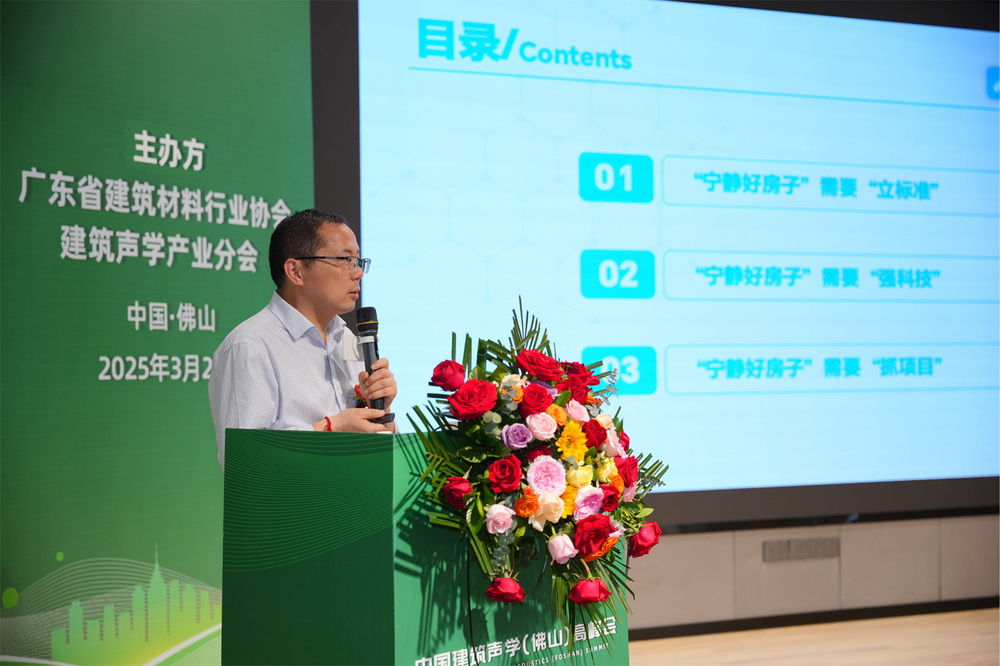 广东建筑声学产业协会会长、广州大学声光所所长彭妙颜从行业发展的宏观角度,分析建筑声学产业面临的机遇与挑战。她指出,随着“十四五”规划明确要求“建设宜居、绿色、健康的高品质住宅”,消费者对“声环境健康”的关注度不断提升,建筑声学正迎来历史性发展机遇。同时,新材料、智能化解决方案等技术的不断突破,也为产业发展注入新动力,呼吁行业内加强合作,共同推动建筑声学产业进步。