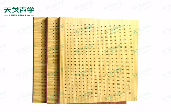 天戈木质微孔吸音板饰面颜色及材料选择性广,孔径、孔距可根据客户要求调整,又叫做木孔吸音板,能很好地满足客户多样化的声学及装饰需求。孔木吸音板对吸声频谱选择性较强,对中低频有很好的吸声性能。如在吸声结构后空腔上填入适量的吸声棉可提高中、高频吸声效果。