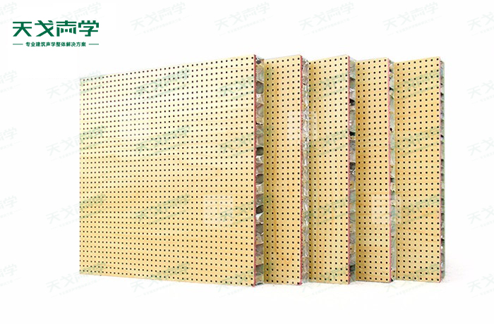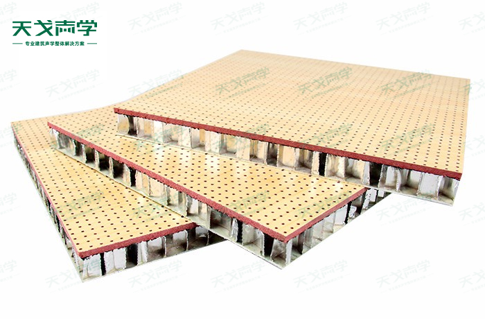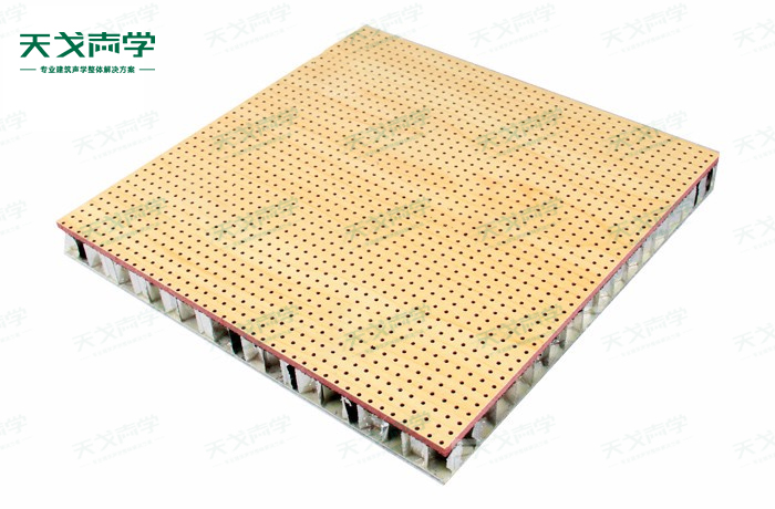 天戈铝蜂窝复合孔木吸音板饰面颜色及材料选择性广,孔径、孔距可根据客户要求调整,能很好地满足客户多样化的声学及装饰需求。孔木吸音板对吸声频谱选择性较强,对中低频有很好的吸声性能。如在吸声结构后空腔上填入适量的吸声棉可提高中、高频吸声效果。