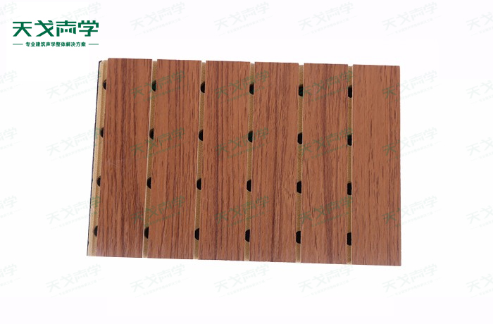 天戈剧场槽木吸音板是一种在密度板的正面开槽、背面穿孔的狭缝共振吸音材料。槽木吸音板对吸声频谱选择性很强,对中低频有很好的吸声性能。若在吸声结构后空腔填入适量的吸声棉可提高中、高频吸声效果,标准化模块设计,采用插槽、龙骨结构,安装简易,常用于墙面或天花装饰。