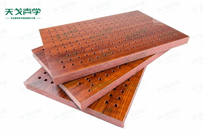 天戈会议室孔木吸音板饰面颜色及材料选择性广,孔径、孔距可根据客户要求调整,能很好地满足客户多样化的声学及装饰需求。孔木吸音板对吸声频谱选择性较强,对中低频有很好的吸声性能。如在吸声结构后空腔上填入适量的吸声棉可提高中、高频吸声效果。