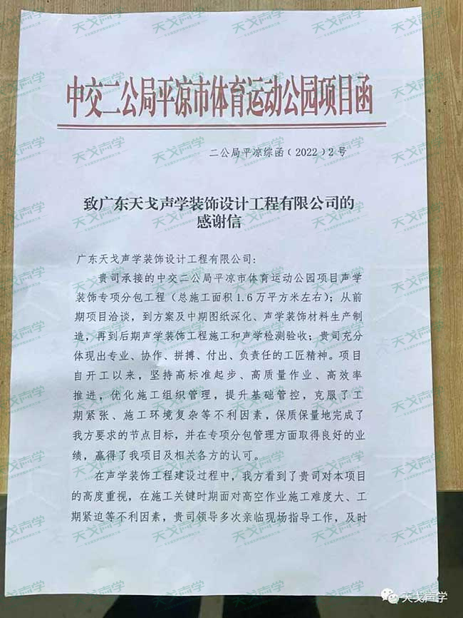 完工后经过专业的声学检测,各项指标均符合原设计标准,场馆音质丰满,清晰、声场分布均匀,平均混响时间达到预计要求,满足该体育场馆的的多功能用途。对此,中交二公局平凉市体育运动公园项目部给天戈声学写了感谢信,对天戈声学在该项目的付出和专业表示认可!