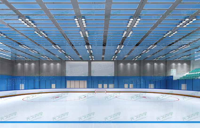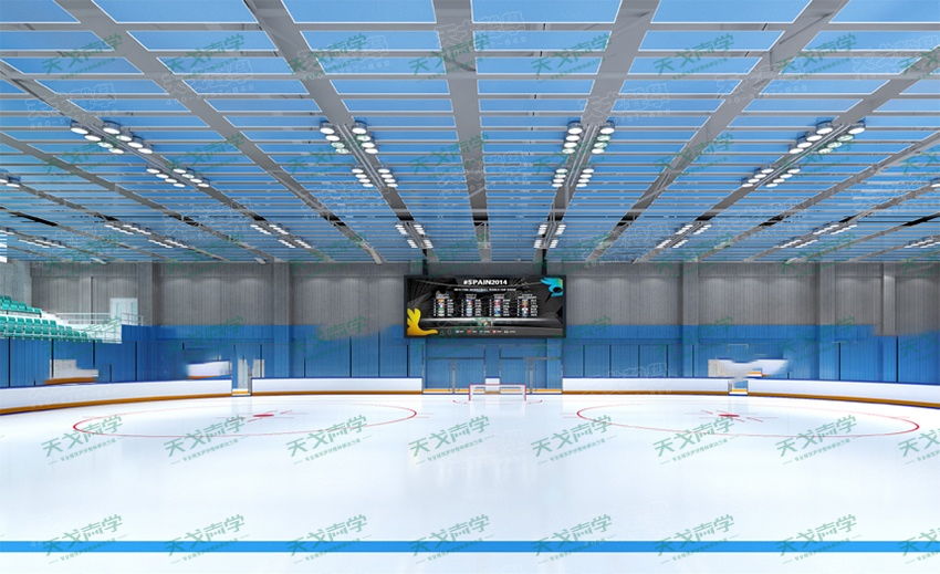 因冰球馆内存在颤动回声、声聚焦和回声等声学缺陷,需要对声学材料进行合理布置,以达到消除各种声学缺陷。为使该冰球馆内混响时间能达到合理水平,我们天戈声学对该冰球馆提出了相应建筑声学设计方案,最终使该体育馆获得了良好的音质效果。我们选择在冰球馆墙面安装蓝色槽铝吸音板,可以消除比赛池的颤动回声。天花同样悬挂蓝色空间吸声体,以便有效地降低了馆内的混响时间,同时大幅削弱顶棚声反射能力,消除了顶棚多重回声问题。