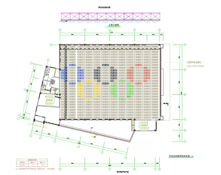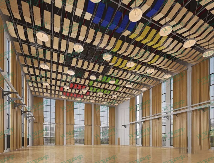 由于场馆天花与地面形成平行面,极容易产生颤动回声。因此顶棚布置吸声性能强的材料或构造,以避免产生颤动回声影响音响设备的正常使用。依据本体育馆的原设计,充分考虑到馆内音质要求,在顶部钢结构下方布置具有防潮防火性能的宽频吸声体。