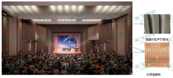 根据报告厅的装饰效果,为了使报告厅具有适宜的响度及语言清晰度,在两侧墙面木纹吸音板处采用红玻吸音板,内填50厚32K吸声棉包,安装空气层不少于100mm,其他部位均安装木饰面。