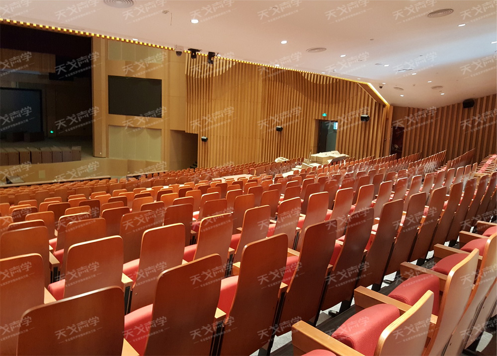 观众厅两侧墙面为典型的平行墙面,在没有经过任何声学处理的情况下,将会产生多重回声,导致中后排作为听众听音浑浊。如果只进行简单地吸声处理,由于该场所还兼顾有演艺功能,在作为演艺厅使用时由于两侧墙面反射声能吸声过量导致整个场所听音干涩,无层次感。因此该墙面必须考虑吸声控制混响,还考虑扩散使整个声场分布均匀。因此表面采用实木格栅做扩散体造型。后墙和挑台处墙面距离声源较远、中高频声能衰减较明显,因此此处采用具有低频吸声较好的材料,木质穿孔吸声结构:木质穿孔吸声结构穿孔率为11%,内填50m48K离心玻璃棉后贴吸声黑毡。