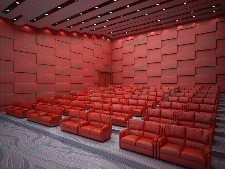 该电影院观众厅内有效面积约为1760㎡,座位数为126座,经声学环境整体解决方案服务商天戈声学为其量身打造声学装饰设计方案以及施工完成后,该电影院观众厅混响时间(满场)达到设计指标要求的0.7s,满足电影院功能的使用。